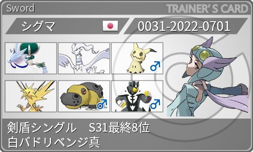 シグマです。 今回は密かに企んでいた白バドと共に最終1桁という目標をなんとか達成することができました! 構築経緯 単体解説 白バドレックス レシラム ミミッキュ サンダー カバルドン 一撃ウーラオス 基本選出 結果 (最終的に使用した白バドのS0個体) 構…
