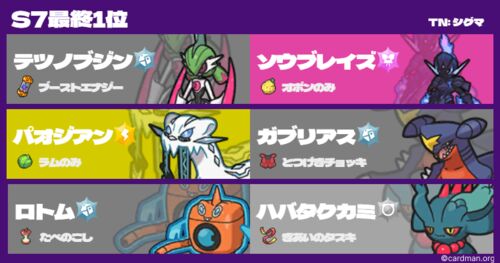 どうも、シグマです。 シーズン7、そしてレギュレーションCお疲れ様でした! ルールは大きく変わりますが、珍しい組み方をしているので簡潔にですが残しておきます。 構築経緯 単体解説 テツノブジン ソウブレイズ パオジアン ガブリアス 水ロトム ハバタク…