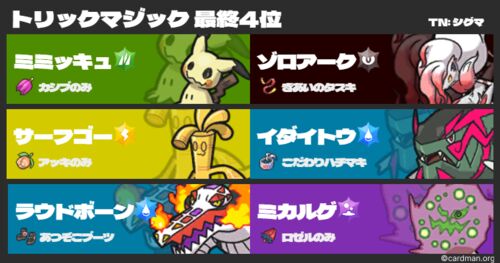 どうも、シグマです! 皆さんトリックマジックお疲れ様でした! 久しぶりのシングルの公式大会ということで充分楽しみながら4位で終えることができました! 記録として簡潔に書くことにします。 考察 単体解説 サーフゴー イダイトウ♂ ラウドボーン ミミッキ…